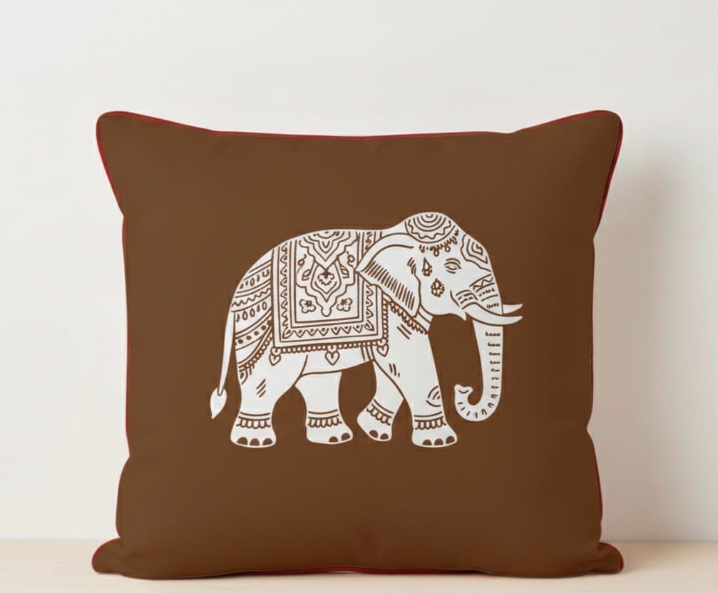 Handcrafted cotton cushion cover with elephant block print motif. Elegant, durable, and rooted in tradition.