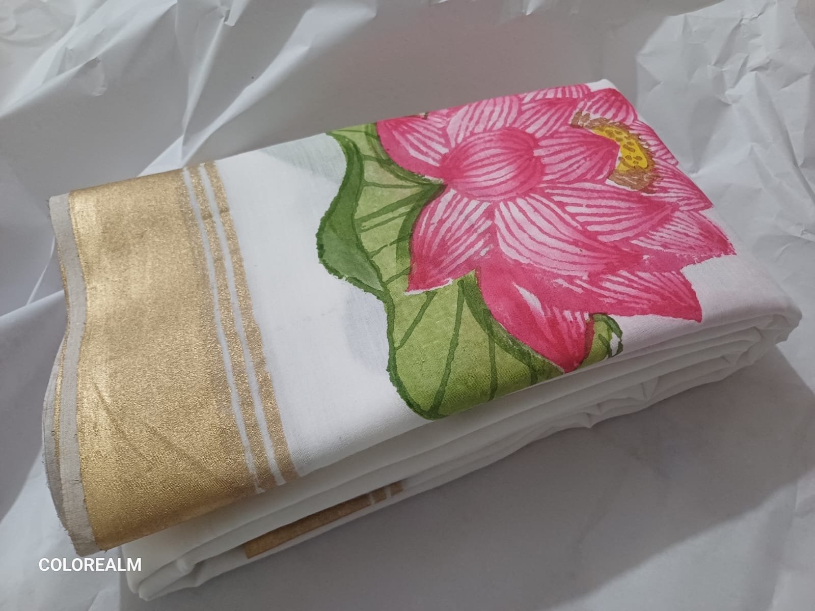 It is the main original image of the saree in folded condition. Hand Block Printed Mal-Cotton ...