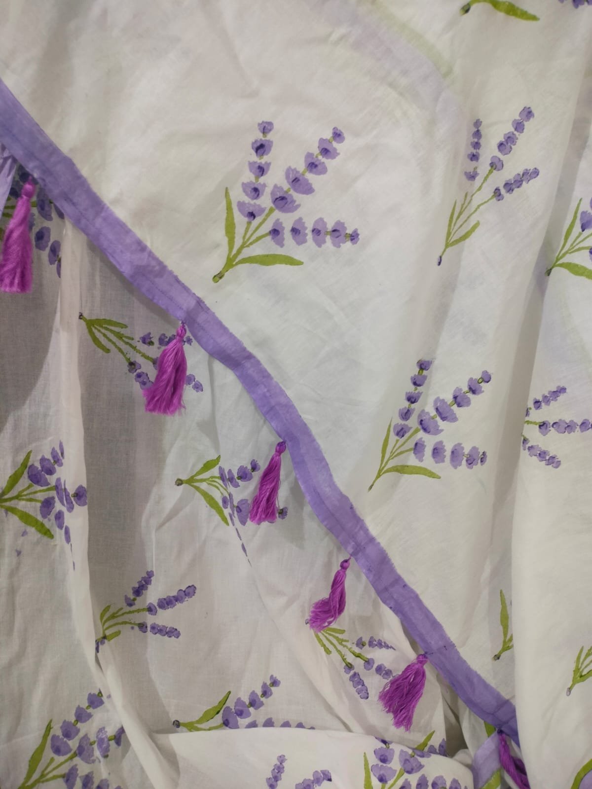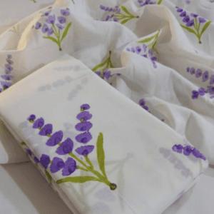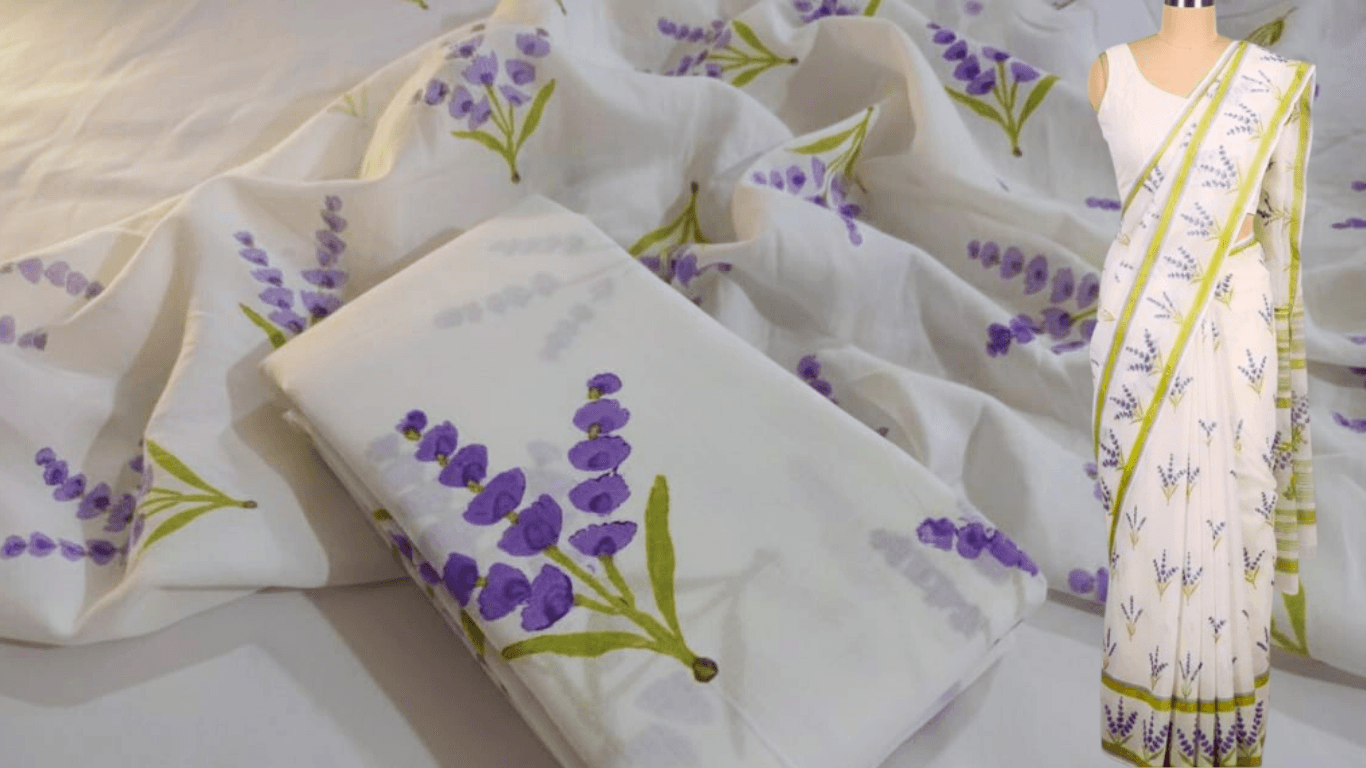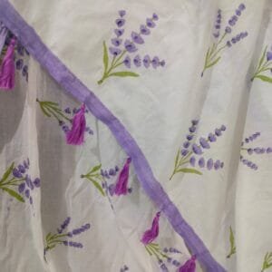 A soft mul mul cotton saree handblock printed with lavender motifs. Lightweight, breathable, and nature inspired—perfect for soulful occasions and mindful living.