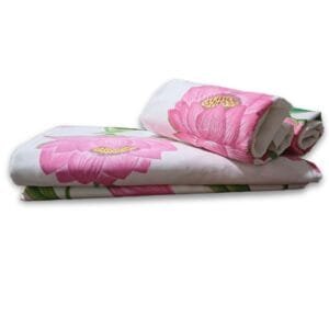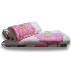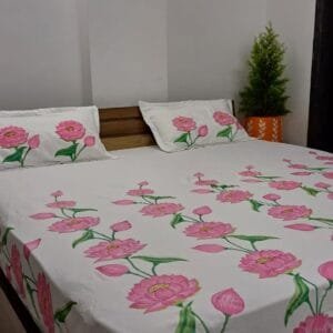 Included in the set are two matching pillow covers, each featuring the same exquisite hand-painted lotus motifs, creating a harmonious and cohesive look. The pillow covers are crafted with meticulous attention to detail, ensuring that they complement the bedsheet perfectly.