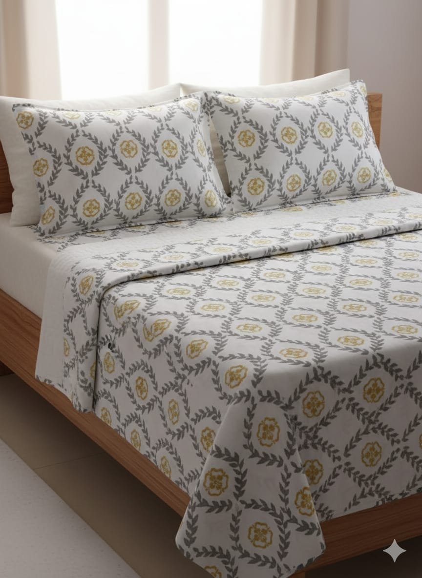 Elevate your bedroom with this luxurious hand-block printed floral bedsheet made from 300 thread count pure cotton. Designed for king-size beds/Queen Size Beds, it offers unmatched softness, vibrant artistry, and breathable comfort—complete with two matching pillow covers.