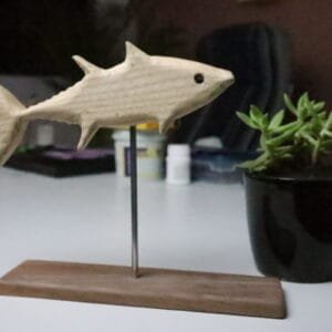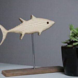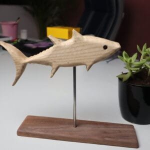 Add a touch of serene craftsmanship to your space with this handmade wooden fish sculpture, exquisitely carved from premium white ash wood. Its natural grain and clean silhouette evoke a peaceful aquatic essence, perfect for modern and earthy interiors alike. Mounted on a stainless steel rod with a solid wooden base, this piece blends structural elegance with organic artistry.