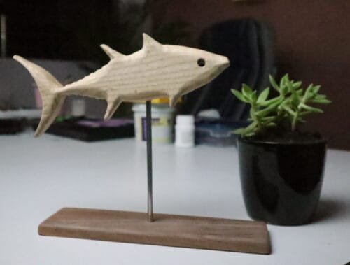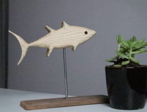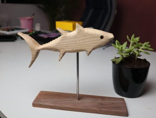 Add a touch of serene craftsmanship to your space with this handmade wooden fish sculpture, exquisitely carved from premium white ash wood. Its natural grain and clean silhouette evoke a peaceful aquatic essence, perfect for modern and earthy interiors alike. Mounted on a stainless steel rod with a solid wooden base, this piece blends structural elegance with organic artistry.