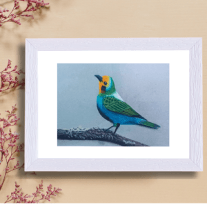 The painting comes elegantly framed, ready to enhance the aesthetic appeal of various spaces. Whether displayed in a study room, music room, hotel, or educational institutions like schools and colleges, this piece adds a touch of nature’s charm and a splash of color. Its lively depiction of the tanager bird makes it a perfect choice for those who appreciate both art and the beauty of the natural world.