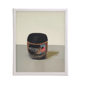Vibrant Detail: The painting portrays a classic Nestle coffee bottle with rich, nuanced colors and a soft, inviting texture that breathes life into the subject.
