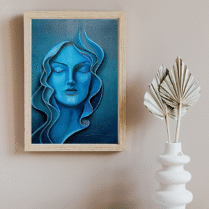 Elevate your space with this 24×30 inch handmade canvas painting from COLOREALM™. Crafted using soft pastel colors, the artwork portrays a tranquil female face with closed eyes and wave-like hair that blends into a textured blue background. The surreal composition evokes peace, introspection, and fluidity—making it ideal for meditation corners, boutique interiors, or collectors of soulful decor.