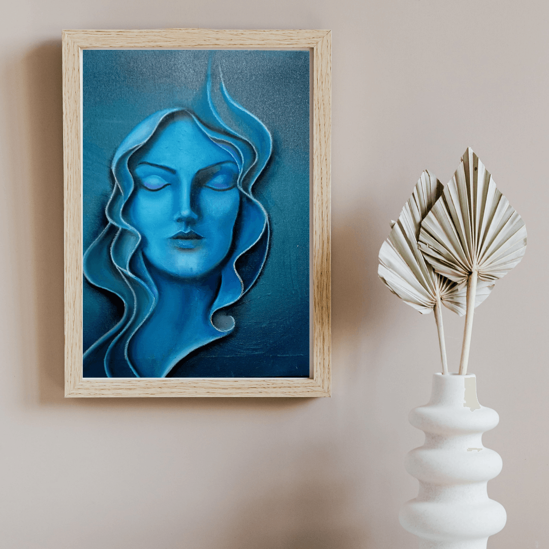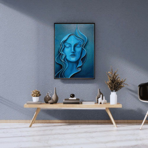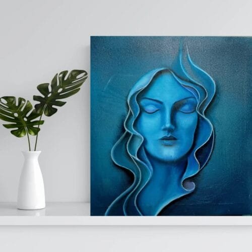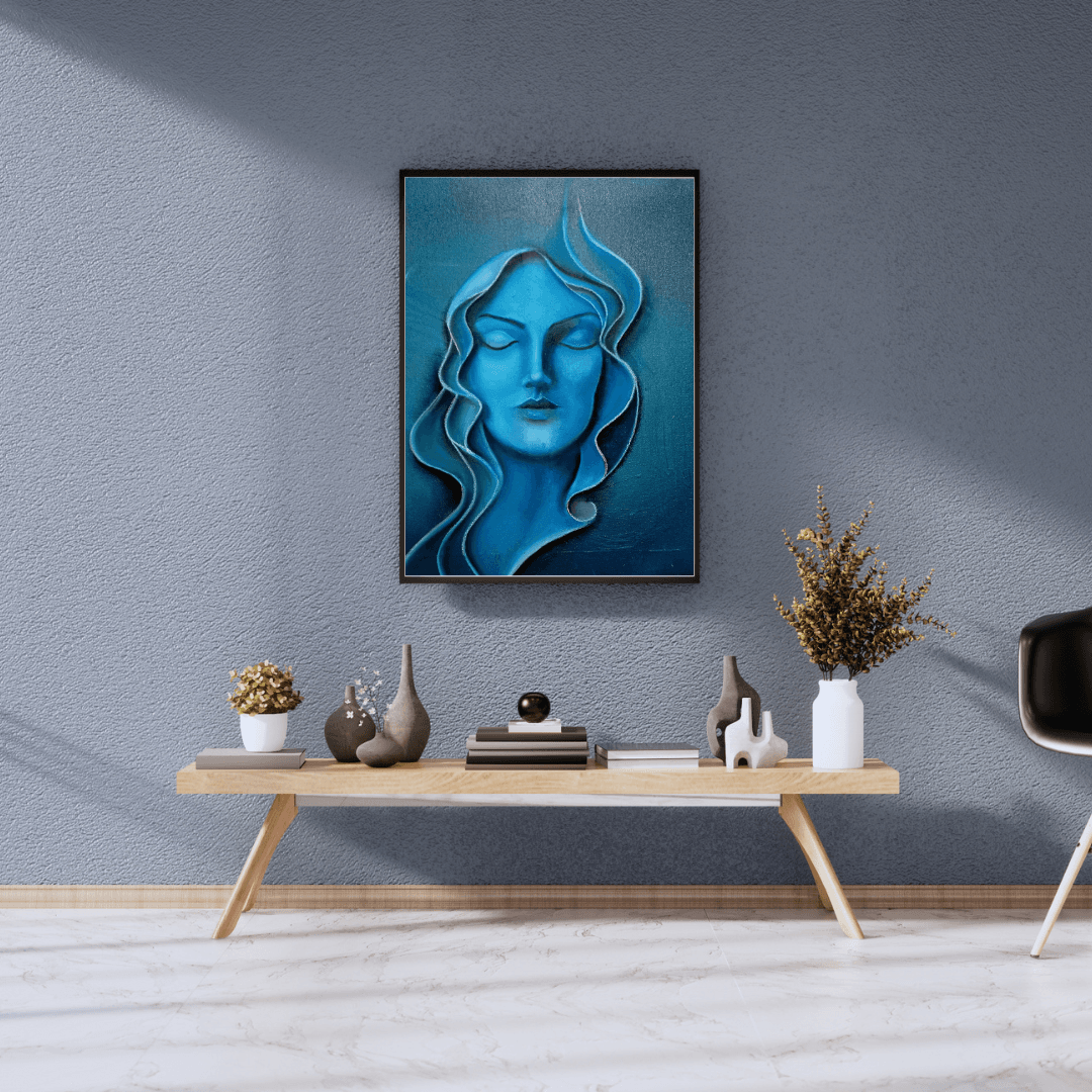 Elevate your space with this 24×30 inch handmade canvas painting from COLOREALM™. Crafted using soft pastel colors, the artwork portrays a tranquil female face with closed eyes and wave-like hair that blends into a textured blue background. The surreal composition evokes peace, introspection, and fluidity—making it ideal for meditation corners, boutique interiors, or collectors of soulful decor.