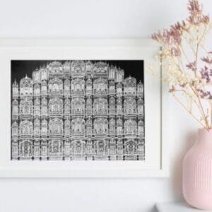 Discover the intricate beauty and architectural splendor of Jaipur’s iconic Hawa Mahal with the “Mesmerizing Hawa Mahal” painting. This unique artwork combines the fluidity of watercolor with the fine detailing of white gelly roll to bring out the palace’s stunning façade, capturing its intricate lattice work and the play of light and shadow.
