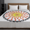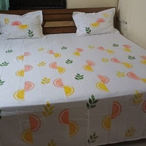 Bring home the joy of handcrafted tradition with COLOREALM™’s “Sunburst Harmony” bedsheet set. Made from premium cotton, this vibrant ensemble features symmetrical semi-circle patterns in warm orange, yellow, and pink tones, paired with delicate leaf motifs in green and gold. Each design is digitally preserved from original hand-painted artwork, ensuring authenticity and charm.