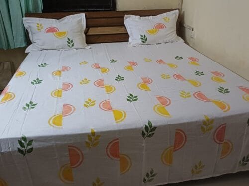 Bring home the joy of handcrafted tradition with COLOREALM™’s “Sunburst Harmony” bedsheet set. Made from premium cotton, this vibrant ensemble features symmetrical semi-circle patterns in warm orange, yellow, and pink tones, paired with delicate leaf motifs in green and gold. Each design is digitally preserved from original hand-painted artwork, ensuring authenticity and charm.